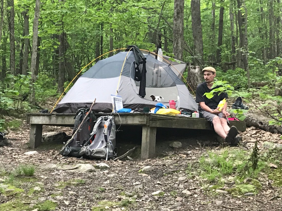 We’re grateful to arrive at the tent site with a nice wooden platform to call our own for the night. The weather is dry so we gather sticks to have a fire.