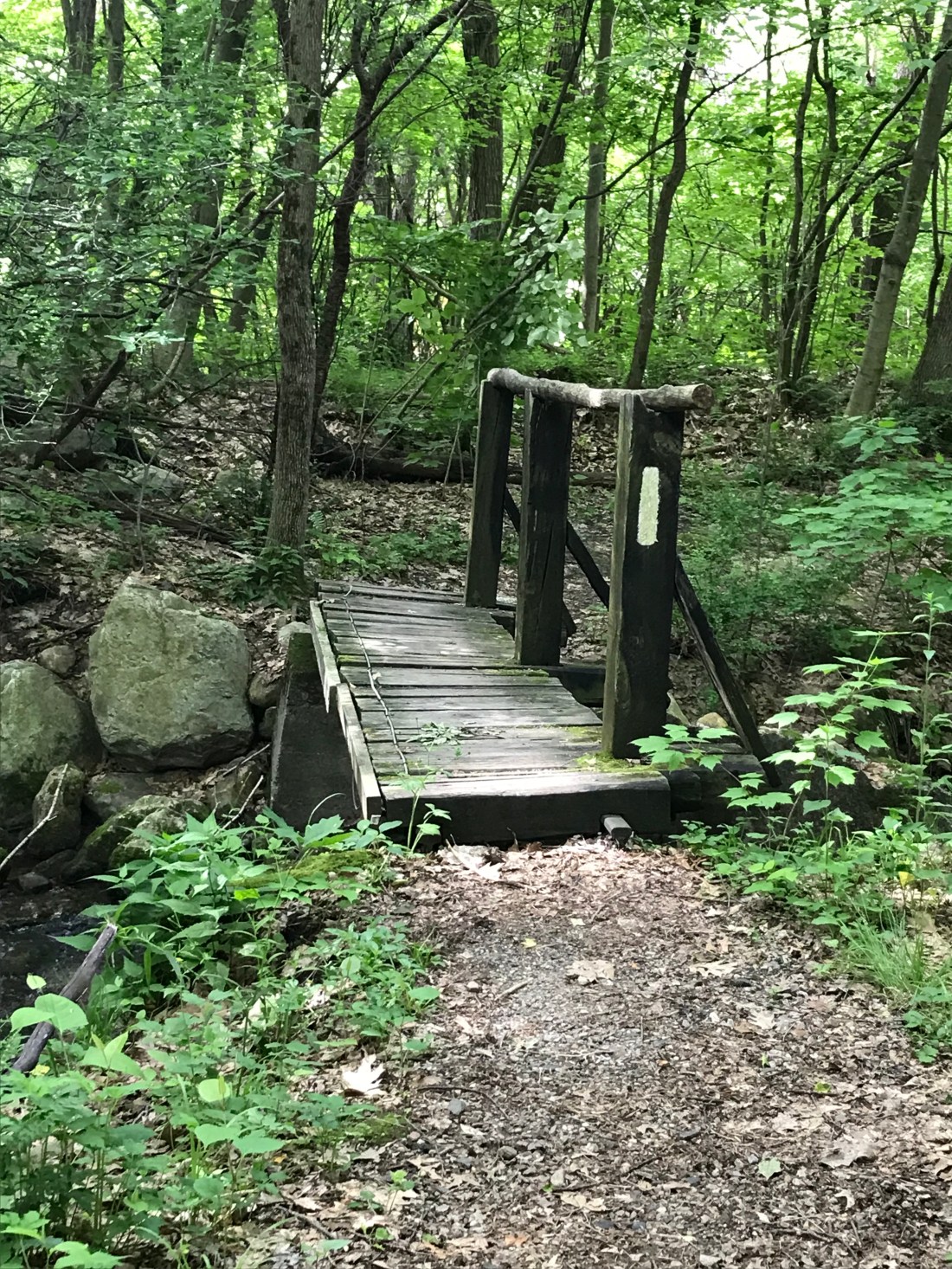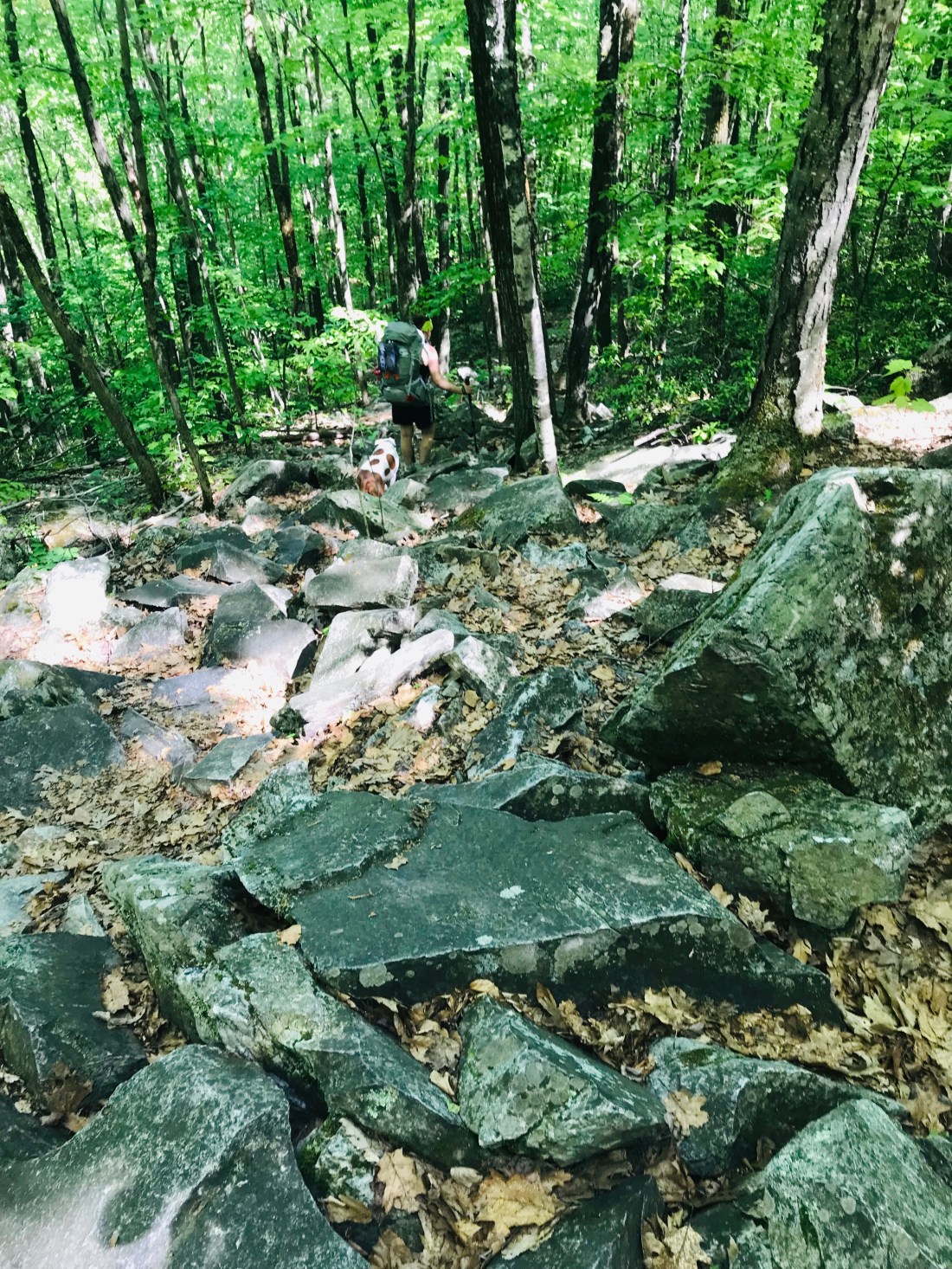 The forest seems to be more open with less old oaks and maples trees. We did however notice a lot more rocks to navigate though. We’re close to the campsite we intend to stay at for the night and have a challenging decent down a steep hill with a rock slide.