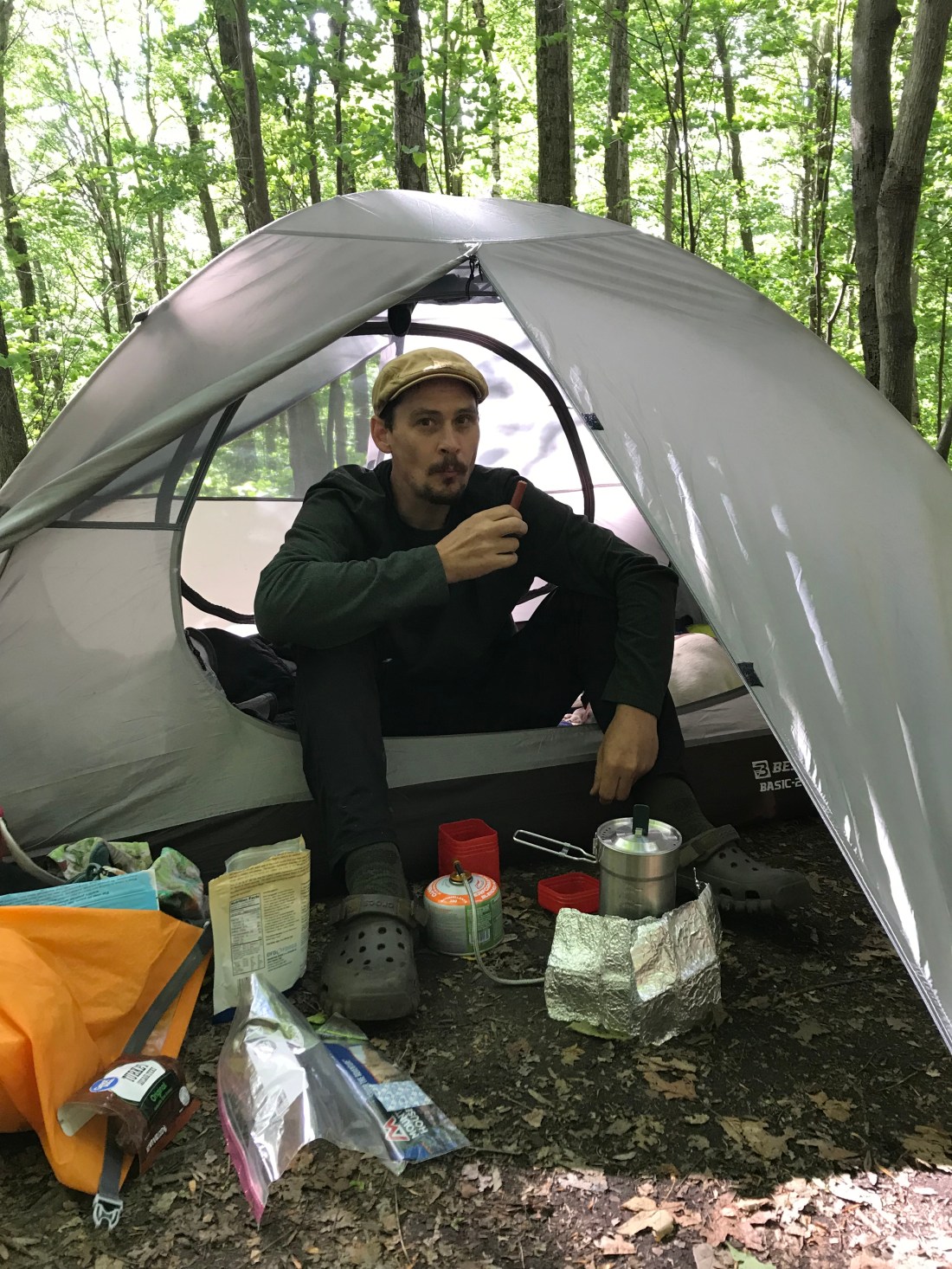Unfortunately though that night was a rough one for me. We relaxed and had supper. Then we laid there in the tent and watched the sun leave the trees as the sun set. All seemed lovely at the time, but then my belly started to gurgle. I don’t know what it was that caused me to feel so awful, but I do know that being in the middle of the woods and feeling this terrible is the worst. Having nothing but an outhouse to sit in as the gurgling passes makes for a long and miserable night. The tummy issues did pass though and I was fortunate enough to get some sleep. I hope I don’t have to deal with that again, whatever it was.