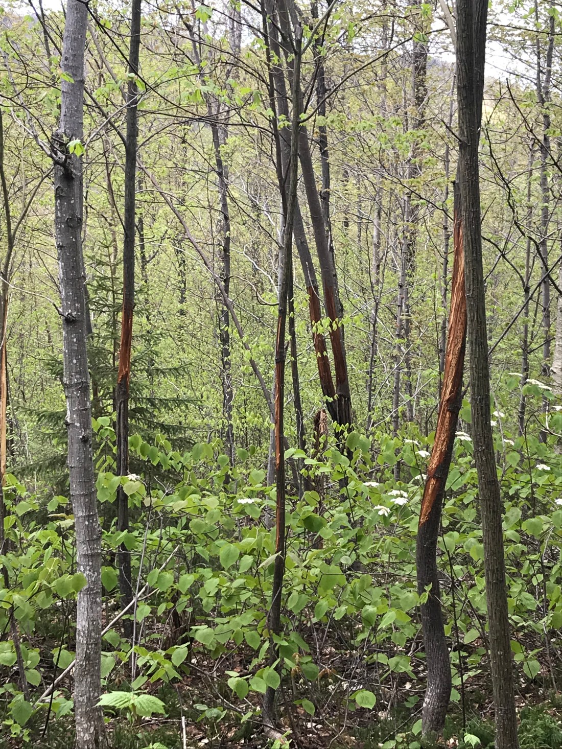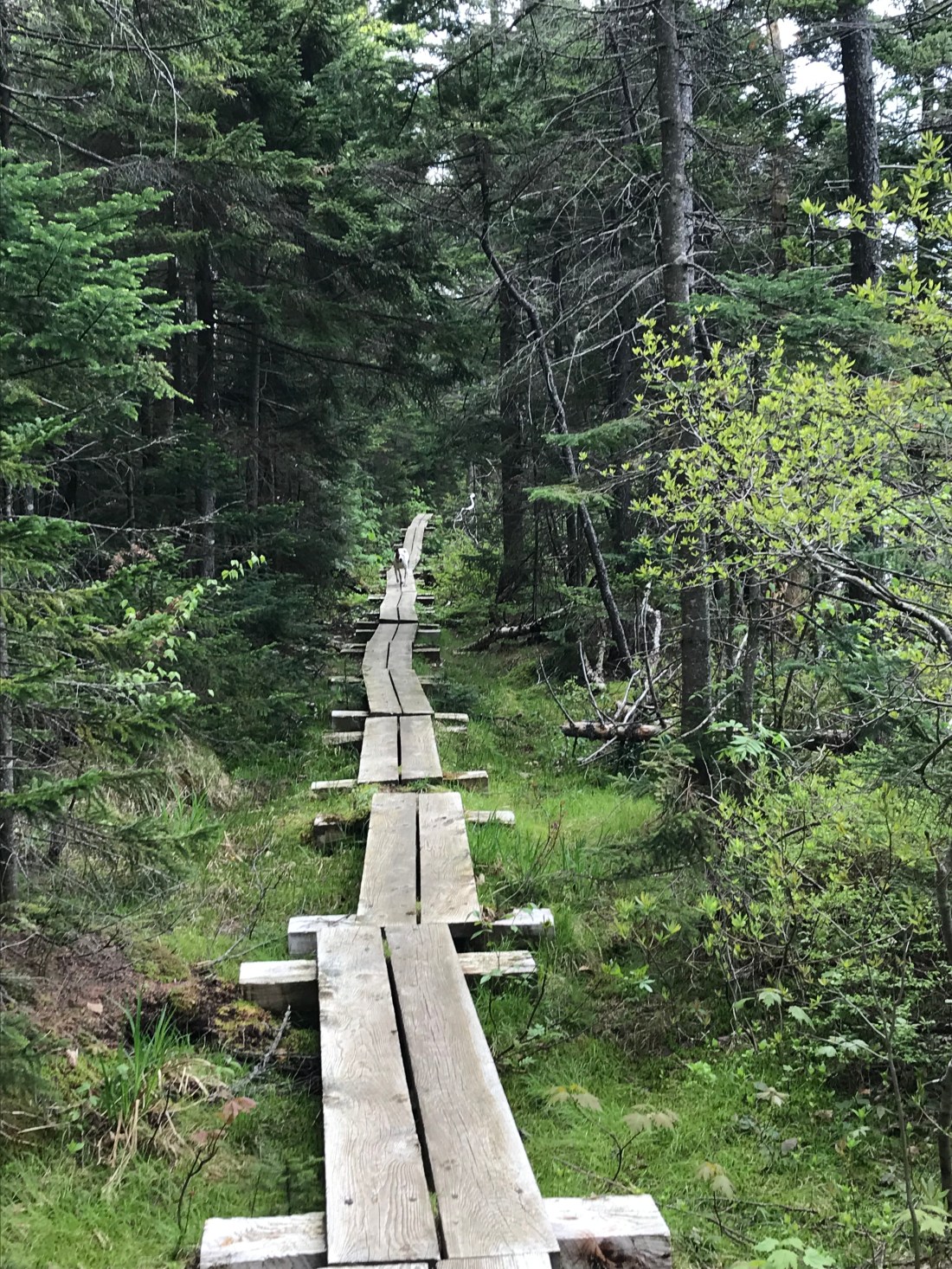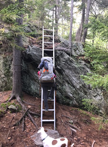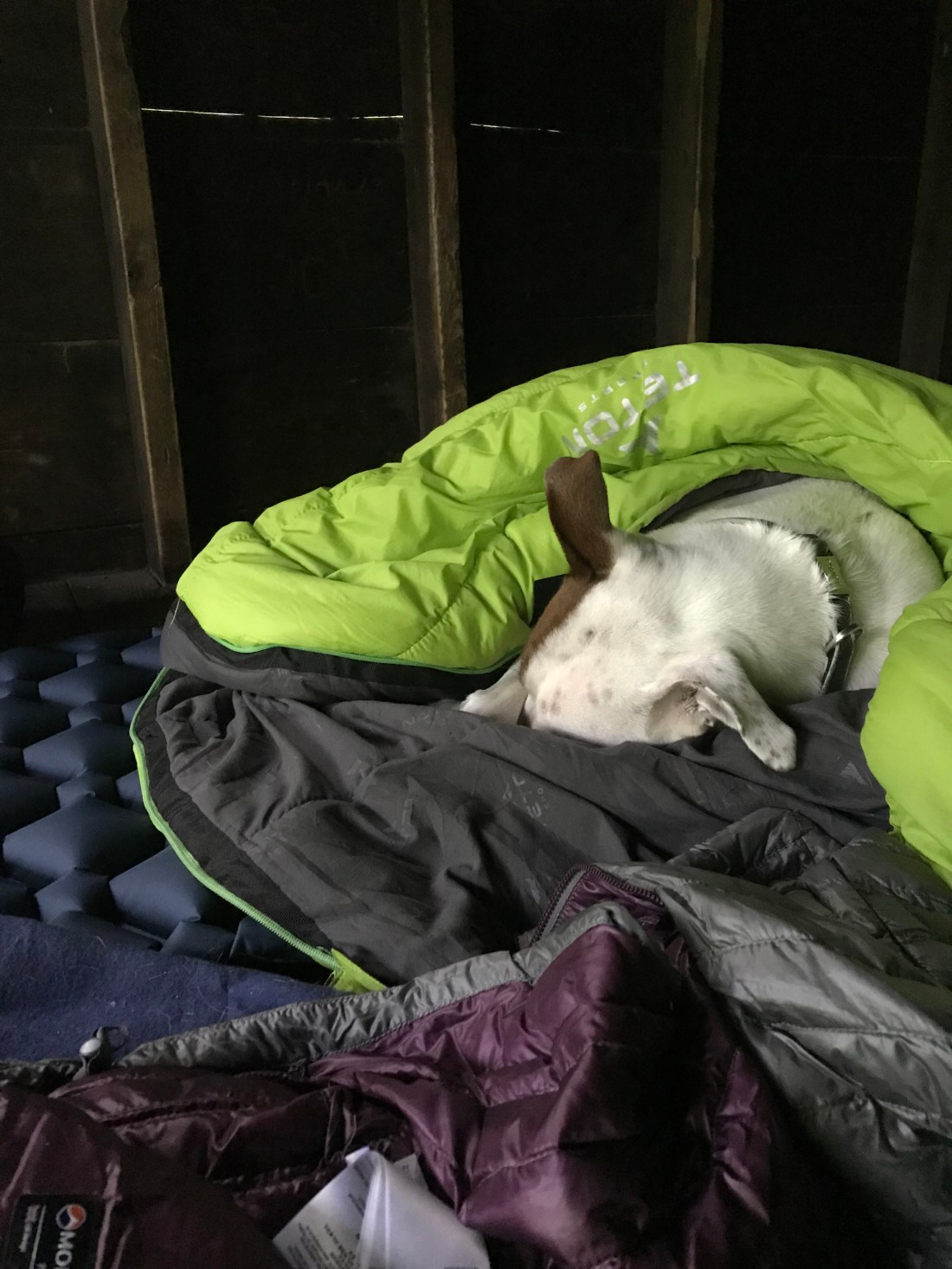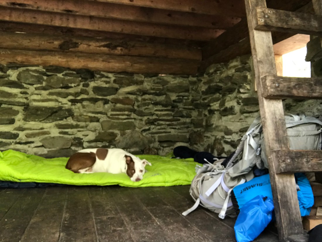 That night we settled into a shelter that had a lot of comments in the log book about porcupines in the area. We could see this was an issue since the shelter support beam was covered in wire and there were chew marks all through the shelter. We put our hiking poles on the steps to discourage any porcupines from coming in and it worked. They were definitely trying to come into the shelter in the middle of the night. You could hear their feet on the bottom step, but that’s as far as they went. They were eating something on one side of the shelter and then one came down the hill talking to the others. They make the most adorable noises. It was so cute. Meadow couldn’t be bothered though. She lifted her head out of bed and then went back to sleep. We also heard a moose make a call in the wee hours of the early morning to another moose near by, but we didn’t see them. It was a really interesting night.